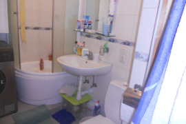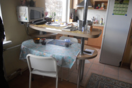 Virtuvė sujungta su svetaine bendra visiems nuomuojantiems-virtuvės komplektas,skalbyklė,šaldytvas.Vonia-dušo kabina ir Wc atskirai.