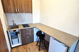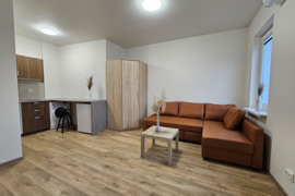 Studijos tipo, moderniai įrengtas, su baldais ir buitine technika, dar negyventas, 1 kambario butas.
