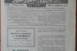 1918 m. Nr. 5, 6, 7, 8, 9, 29 (negiljotinuotas-neskaitytas), 31 (negiljotinuotas-neskaitytas), 32 (negiljotinuotas-neskaitytas) 31x25 labai retas aukcioninis, antikvarinis-kolekcinis Nepriklausomas visuomenės laikraštis. Lietuvos krikščionių demokratų partijos savaitraštis, 1917–18 ėjęs Vilniuje. Rašė politikos, religijos, švietimo, literatūros, ūkio ir kitais visuomenės klausimais, skleidė tautiškumo, katalikybės idėjas. Savaitinis visuomenės, politikos, mokslo, literatūros ir ūkio laikraštis. Atsakomasis redaktorius-leidėjas agronomas A. Stulginskis, bendradarbiai: K. Bizauskas, kun. K. Čibiras, kun. P. Dogelis, L. Gira, kun. M. Reinys, kun. J. Staugaitis, A. Vileišis ir kt. po 18 €