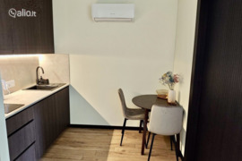 • Svetainės ir virtuvės erdvė išlaiko vientisą, šviesią atmosferą – moderni virtuvėlė su integruota buitine technika.