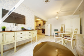 - Svetaine kartu su virtuve: Stalas, kėdes, sofa, televizorius, spintelės, komoda, spinta