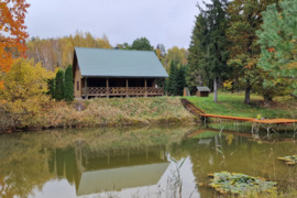 Didelė terasa su vaizdu į mišką bei tvenkinį.