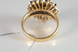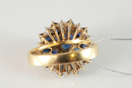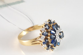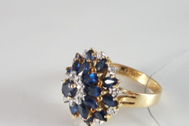 Moterims | Žiedai | Kitas | Aukso, bronzos | Dėvėtas <br /> Auksinis žiedas su safyrais ir briliantais. Auksas geltonas. Praba 750. Svoris 7,71gr., briliantai 20vnt. -0.10ct. RW-W/SI1-P1, safyrai 21vnt. - 3.00ct. 7/4, 6/5 SI. Dydis 18.Tvirtas, prašmatnus. Būklė puiki. Žiedas labai įspūdingas, deja, nuotraukos to neperteikia. Žiedas nepigus, tad susitarus dėl laiko, siūlau apžiūrėti ir pirkti vietoje.+37060667851