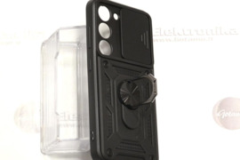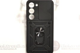 B-Ultra dėklas nugarėlė šarvai Samsung Galaxy S23 mobiliajam telefonui (SM-S911B, SM-S911B/DS, SM-S911U, SM-S911U1, SM-S911W, SM-S911N, SM-S9110, SM-S911E, SM-S911E/DS) juodos spalvos. B-Ultra dėklai pasižymi B-Safe dėklų, B-Private dėklų ir B-Hold dėklų savybėmis. Dėklas nugarėlė yra pastiprintas tarsi šarvai ir itin gerai apsaugo. Guminė nugarėlė pagaminta iš vientiso itin kokybiškos gumos lydinio kuris nėra dažytas, todėl yra labai patvarus, nesibraižo, nekeičia spalvos, nenusitrina, neišsitampo. Ant nugarėlės pritvirtintas metalinis žiedas. Palikus užlenktą žiedą, dėklas nugarėlė gali būti su telefonu tvirtinama prie magnetinio auto laikiklio (nereikia papildomo magneto). Atlenkus žiedą, jį galima sukioti 360 laipsnių kampų. Patogu per žiedą įkišti pirštą, kad dėklas su visu telefonu neiškristų iš rankų, arba dėklo nugarėlės pagalba telefoną pastatyti ant stalo. Ant dėklo nugarėlės įtaisytas slankomas skydelis, skirtas kameros blokui uždaryti. Uždarius kamerą, ši apsaugoma nuo dūžių, bei suteikiama daugiau privatumo. Uždarius vartotojas apsaugomas nuo nepageidaujamo gamintojo šnipinėjimo per telefono kamerą. Papildoma apsauga telefono kamerai - kameros bloko plotas nėra tiesiog iškirptas, o pritaikytos atskiros skylutės kiekvienai linzei.
