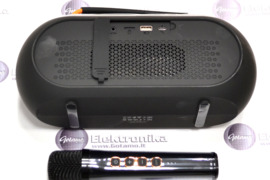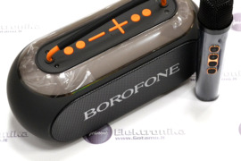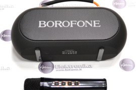 Nešiojama kolonėlė garsiakalbis Borofone Wireless Karaoke juodos spalvos. Kolonėlė su karaoke funkcija - į komplektą įeina bevielis mikrofonas. Kolonėlės viršuje įtaisyta LED juosta, šviečianti kintančiomis spalvomis. Yra jungtis Micro SD kortelei bei USB atmintinei, tad muziką galima groti iš kortelės ar USB atmintinės. Kolonėlėje yra radijas. Įkrovimui skirta Type-C jungtis, taipogi yra ON/OFF jungiklis, bei patylinimo pagarsinimo mygtukai. Komplekte garsiakalbis, Micro USB laidas baterijos įkrovimui, AUX 3.5mm laidas, bevielis mikrofonas. Garsiakalbio išmatavimai: 274 x 119 x 105 mm.