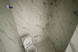 -Dušas kartu su tualetu, išklijuotas akmens masės balto marmuro imitacijos plytelėm.