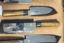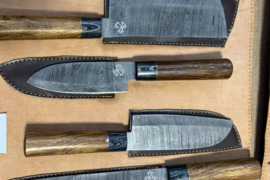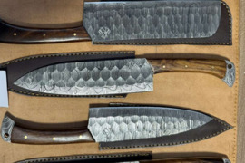 Natūralus odinis dėklas.Rankų darbo šefo peiliai.Geležtė Damasko plienas.