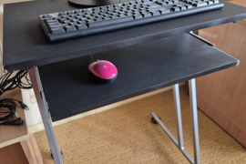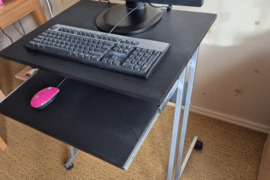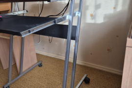 parduodu mažai naudotą kompiuterio staliuką: nedidelis, su ratukais, turi ištraukiamą lentyną klaviatūrai ar pelei, lengvas, patogus. Ilgis 60 cm, plotis 50 cm, aukštis 74,5 cm.