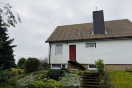 Namas šildomas kieto kuro katilu , radiatoriais ;