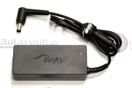 Nešiojamo kompiuterio kroviklis Akyga. Išeinanti įtampa 19.5V 3.34A (65W). Kištukas apvalus, skersmuo 7.4mm, kištuko vidinės skylutės skersmuo 5.0mm. Viso kroviklio ilgis 1.25 metro.