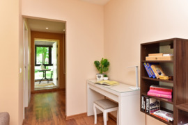 Miegamajame – dvigulė lova 180×200 su ortopediniu čiužiniu, drabužių spinta, lygintuvas, lyginimo lenta, darbo stalas, švari satino patalynė ir rankšluosčiai.