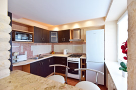 Virtuvėje – didelis šaldytuvas su šaldymo kamera, indai, įrankiai, dujinė viryklė su orkaite, mikrobangų krosnelė, arbatinukas, skrudintuvas, kapsulinis kavos aparatas, kava, arbata, cukrus, aliejus.