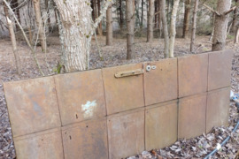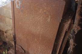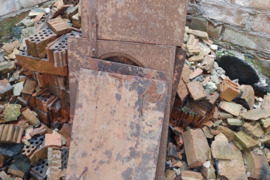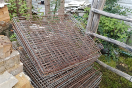 Durys, stogo skardos, židinys, vamzdžiai, lentynos ir pan.