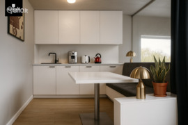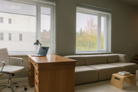- Šiuolaikiškai, šviesiai ir kokybiškai įrengtos patalpos su visomis komunikacijomis. Patalpos šildomos grindine aerotermine šildymo sistema, įrengta virtuvės zona.