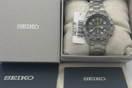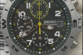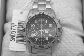 Vyrams| Laikrodžiai| Naujas <br /> Naujas (neišpakuotas) SEIKO laikrodis-chronografas.SEIKO pripažintas geriausiu Japonijos gamintoju.Pagamintas Japonijoj."MILITARY" stilius.Tarptautinė garantija.Korpuso diametras 39mm, matiniai poliruotas nerūdijantis plienas.Atsparumas vandeniui - 100 m.Apyrankes ilgis reguliuojamas 180-200mm.Aukštos kokybės vyriškas „Seiko SND377P“ chronografinis kvarcinis laikrodis su nerūdijančio plieno korpusu ir dirželiu, šviečiančiomis rodyklėmis, atsparumu vandeniui iki 100 metrų ir tiksliu japonišku mechanizmu. Šis modelis turi datos langelį, tris papildomus ciferblatus chronometro funkcijoms ir besisukantį kompaso formos rėmelį. Idealiai tinka kolekcionieriams ir kasdieniam nešiojimui.