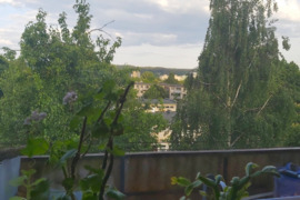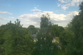 Trijų kambarių butas su panoraminiais vaizdais ir žalia namo aplinka.
